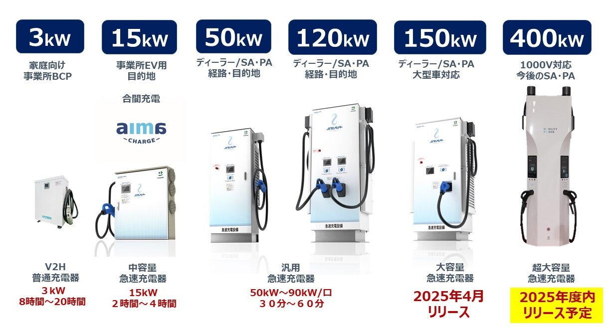 2025年度内の出荷開始を予定しており、この次世代超急速充電器が完成した時点での東光高岳の急速充電器「SERA」シリーズのラインアップは下記となる予定です。