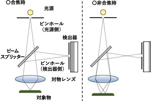 三次元センサは,光を利用して対象物の形状を三次元的に計測する物である。計測原理は,光計測の一つである共焦点方式を採用している。図2 に共焦点方式の計測原理を示す。光源側ピンホールから射出された光が,レンズを通過して,対象物に焦点を結ぶ(合焦)時,反射光が光学的に同じ位置にある検出器側ピンホールに焦点を結ぶ一方で,対象物への焦点を結ぶ度合いによって,検出器側ピンホールを通過できる光の量が変化し,検出器の出力が変化する。この特徴を共焦点効果と呼ぶことにすると,この共焦点効果を利用して,対象物の高さを計測することが可能になる。実際の計測では,対象物を光軸方向に駆動する,あるいは,レンズを駆動することで,サンプリング位置における検出器の出力値を取得し,値が最大となる位置を検出することで高さ計測を行っている。三次元計測を実現するためには,さらにXY方向にもスキャニングする必要があり,一般的には計測時間がかかる方式である。