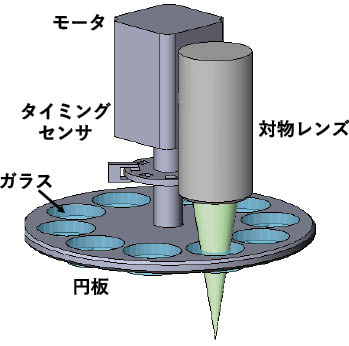 円板方式による焦点移動機構の構造を図3 に示す。円板の円周上には,厚みの異なる平行平面ガラスが並べられており,すべての平行平面ガラスの中心が対物レンズの光軸を横切るように円板を連続回転させると,ガラスの厚さに比例して対物レンズの焦点位置が移動する。この特徴を利用することで,高速な光軸方向の走査を実現していた。しかしながら,円板への平行平面ガラスの取付け姿勢誤差(傾き)が完全には取り切れず,入力した画像に横ずれが発生して計測に誤差を生じさせる問題があることがわかっている。現在開発している三次元センサでは超微細バンプを計測する必要があるため,この横ずれ誤差の影響は大きいことは間違いなく,新たな光学的焦点移動機構を開発することとなった。