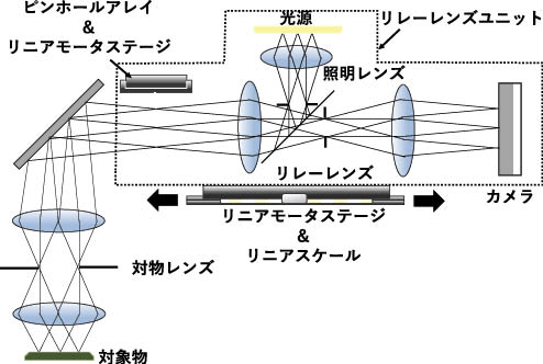 前節の課題を解決して高速化を図るために,多数のピンホールを二次元に配列したピンホールアレイ(以下,PHA)を採用することで,XY方向のスキャニングする必要無くその領域を画像として情報を取得できる共焦点撮像系を構成した。PHAを用いる場合,PHA上の各ピンホールの間隔は,共焦点効果を得るために,一定の距離を離して配置する必要がある。ただし,このままでは,ピンホール以外のマスクされた部分は不感領域となり,分解能が著しく落ちてしまう問題が生じる。そこでPHAをリニアモータステージへ搭載し,一方向へ走査することで,マスク領域で取得できなかった対象物の情報を取得可能とし,高解像度の撮像を実現している。リニア走査の詳細については,参考文献(1)を参照されたい。