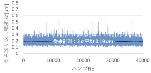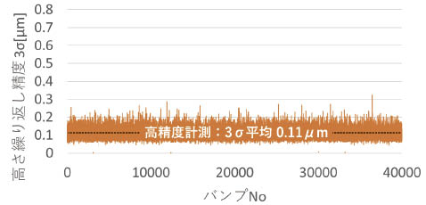 超微細バンプの高さ計測の繰り返し精度評価の結果を図6 に示す。計測対象のバンプは,5.7μm径,10μmピッチの球状バンプ40,000個である。基板からバンプ頂点までの高さを120回繰り返し計測し,バンプ毎に計測値のばらつきを表す3σ値をグラフ化している。各バンプの繰り返し精度の平均は約0.19μmであり,高精度に計測できていることがわかる。