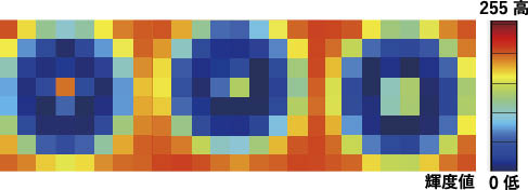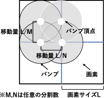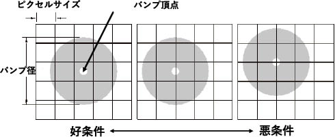 5.7μm径の球状バンプを計測した時の全焦点輝度画像を図7 に示す。全焦点輝度画像とは,立体物の形状に対し,すべての高さで焦点が合っている画像であり,共焦点計測の結果として得られる画像である。バンプ頂点に注目すると,1画素で光るものもあれば,数画素で光るものも存在し,この見え方によって,計測結果のばらつきに影響があることが判明しており,これを画素割れ問題と称している。この現象は,バンプ頂点と検出器の画素の位置関係で発生している。(図8 )。そして,バンプが微細であるほど本現象は顕著となる。
