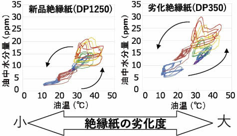 油温変動に対して,油中水分量はヒステリシスループ状の変化傾向を示しており,油温の変化に伴う水分の吸脱着を感度良く捉えていると考えられる。また,絶縁紙の劣化に伴い油中水分量が増加する方向にループがシフトすることが確認された。これは絶縁紙の劣化により,水分平衡が油側へシフトしているという知見と合致している。以上より油温と油中水分量をセンサで取得することで,絶縁紙の劣化度の推定が可能であると示唆された。