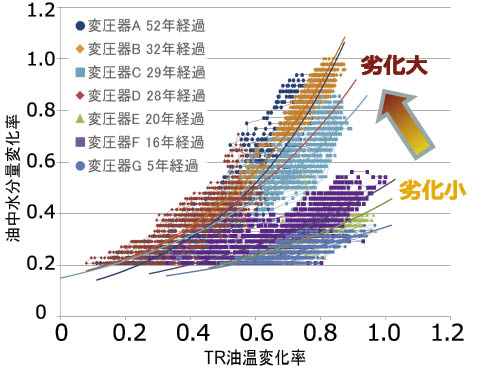 これは普通紙使用変圧器で取得している実器データを活用して耐熱紙使用変圧器の劣化診断が実現できる可能性があることを示唆している。
