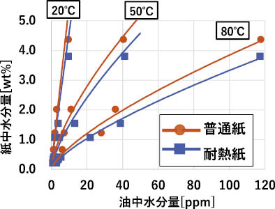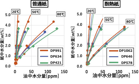 図5 に普通紙,耐熱紙の各DPにおける水分平衡関係を示す。普通紙,耐熱紙のどちらもDPが小さくなるほど油中水分量が増加する方向に移動していることから,耐熱紙においても普通紙と同様に,劣化に伴い水分平衡が油側へシフトする傾向であることが確認できた。
