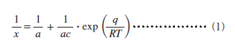 (x:単分子吸着量,a:定数,c:吸着質の濃度,q:吸着熱,R:気体定数,T:絶対温度)