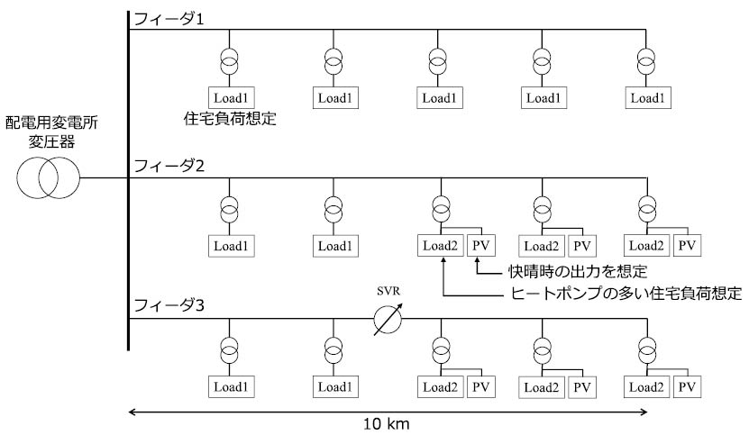 図1に示すように,1台の配電用変電所変圧器に,負荷特性やPVの導入状況が異なる複数のフィーダが接続されたモデルを考える。本解析では,複数台の柱上変圧器,各種負荷,PVなどを一つの要素に集約している。各フィーダの亘長は10kmを想定しており,等間隔に負荷やPVを接続している。各フィーダの概要を表1に示す。