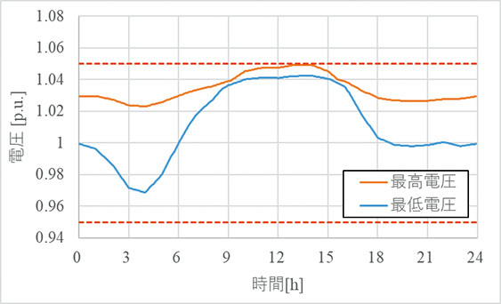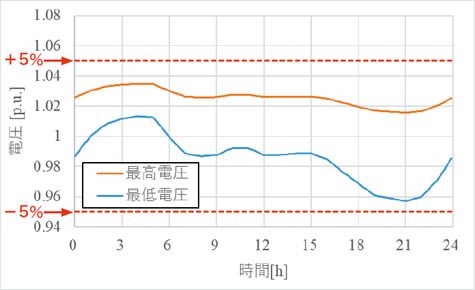 図3に,PVが接続されていないフィーダ1の電圧変動解析結果を示す。同図はフィーダ内の最高電圧,最低電圧の時間変化を示している。配電用変電所変圧器のタップ調整により,±5%以下の変動に収まっていることが確認できる。