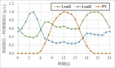 図1のLoad1は一般的な住宅負荷を想定しており,Load2はヒートポンプが多く設置され,深夜帯の消費電力が大きい住宅負荷を想定している。また,Load2にはPVを併設した。それぞれの日負荷曲線およびPV出力を図2に示す。同図は,1日における負荷の最大値,発電量の最大値を1p.u.として示している。それぞれの負荷特性は文献(6)を参考に,PV出力は快晴を想定して設定した。