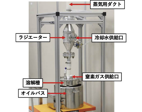小型のエポキシモールド機器を溶解するベンチスケールの溶解設備(以下,本設備)を図1に示す。本設備のオイルバスに,溶解槽(溶解液とエポキシモールド機器を入れた容器)を入れ加熱して溶解する。溶解時には冷却水と窒素ガスを供給することで,溶解の効率と安全性を高めている。