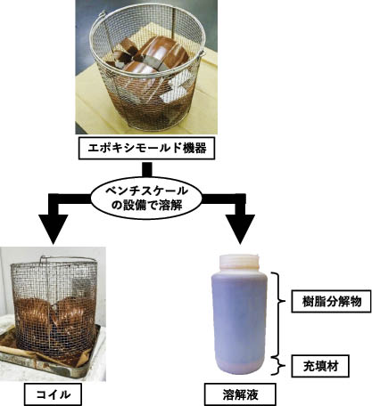 カゴに収めた供試器をカゴごと溶解槽に入れ,さらに溶解液に浸している。溶解槽を加熱すると溶けないコイルや端子等の金属がカゴに残り,樹脂だけが溶け出すことで分離されることになる。分離された樹脂分解物は溶解槽の中で液体として取り出すことができる。充填材はこの液体中に分散しているため,樹脂分解物と併せて回収した後,分離する。樹脂分解物と比べて充填材の比重が大きいため,一定時間静置させることで充填材が沈降し樹脂分解物と分離することができる。樹脂分解物の液中に一部金属くずが残留するが,ふるいで簡単に除去が可能である。