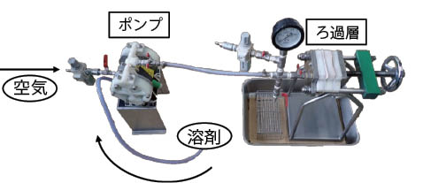 図3に充填材の洗浄に用いる加圧ろ過装置を示す。溶媒に分散させた充填材をこの加圧ろ過装置に流し,ろ過層にため込み洗浄する。洗浄は溶剤と精製水をろ過装置に流して行う。加圧ろ過を用いることで溶解液にベンジルアルコールのような粘度の高い液体を用いても効率よく洗浄することができる。ろ過層のフィルターとして用いるろ布については,ろ過の効率,充填材の回収率について検証し,選定している(5)。