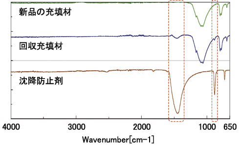 回収充填材の不純物を調査するために元素分析した結果,不純物は沈降防止剤であることが確認できた。沈降防止剤は樹脂にあらかじめ配合され,分散した充填材が比重差によって沈降しないよう緩和するためのものであり,配合量は充填材に比べごくわずかである。図5に新品の充填材と回収充填剤,沈降防止剤のFT-IRによる分析結果を示す。なお,図4と同様スペクトルを縦軸方向に移動して並べている。図5の赤枠部分は新品の充填材にはない回収充填材特有のピークであり,沈降防止剤が持つピークと一致していることが確認できる。ピークの高さの違いは,回収充填材に含まれる沈降防止剤が微量であるためと考えられる。