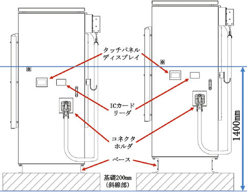 ユーザの利便性向上を具体化するため,経済産業省および国土交通省が策定した「電動車のための公共用充電施設におけるユニバーサルデザイン・バリアフリー対応に関するガイドライン」(3)には緊急停止(非常停止)ボタンを除く急速充電器の操作高さを1,400mm以下とするよう,明記されている。本器はこれに基づき,最大で200mmの基礎(台座)上に設置した場合にも急速充電器の操作高さが1,400mm以下となる配置とした。なお,オプションとなる高さ違いのベース(電源引込用の通線口付)使用時においても,本ガイドラインを満たしたものとなっている。標準仕様およびオプション仕様での機器の操作高さを表3,外形を図5に示す。