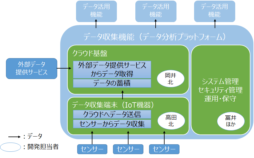 冨井当社では電力設備のスマートメンテナンスや状態診断において、データ活用の高度化を目指した研究開発を行っています。その取り組みの一環として、当社小山事業所、蓮田事業所の設備に設置したセンサからデータの収集を始めました。(太陽光発電予測に関する日射量や発電量、変圧器状態診断に関する油温や油中水分量など。)その中でこれまでサービスごとに開発していたデータ収集機能を汎用化するデータ分析プラットフォームを作ろうとなったのが今回の開発プロジェクト発足の経緯です。